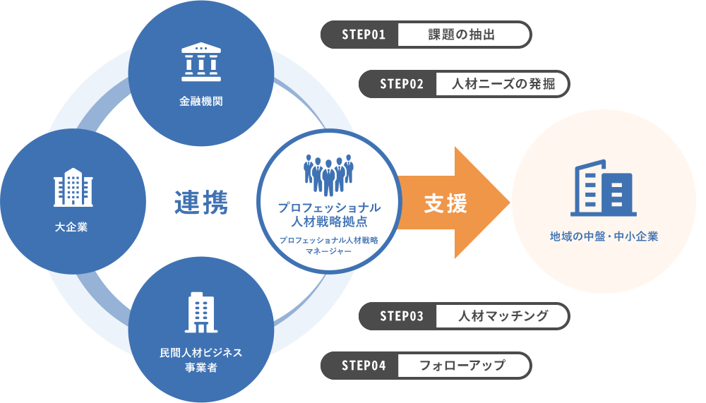さらに、人材のマッチング後においても、関係機関と協力し、当該企業の経営課題の解決や、成長戦略の実現などに向けて、フォローアップを行います。
