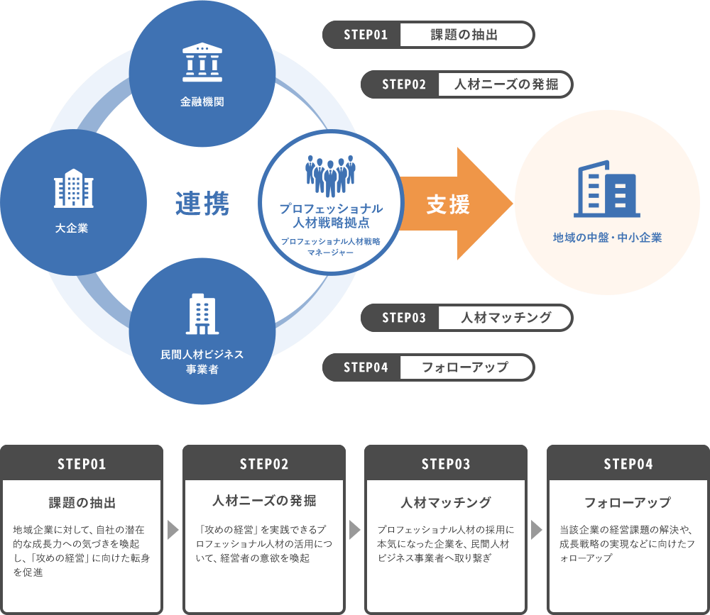 次に、その経営課題の解決に向けて、様々な方法を検討し、プロフェッショナル人材という外部人材の活用が必要な場合には、どのような人材が必要なのか、その人材要件を具体化し、民間人材ビジネス事業者へ取り繋ぎます。